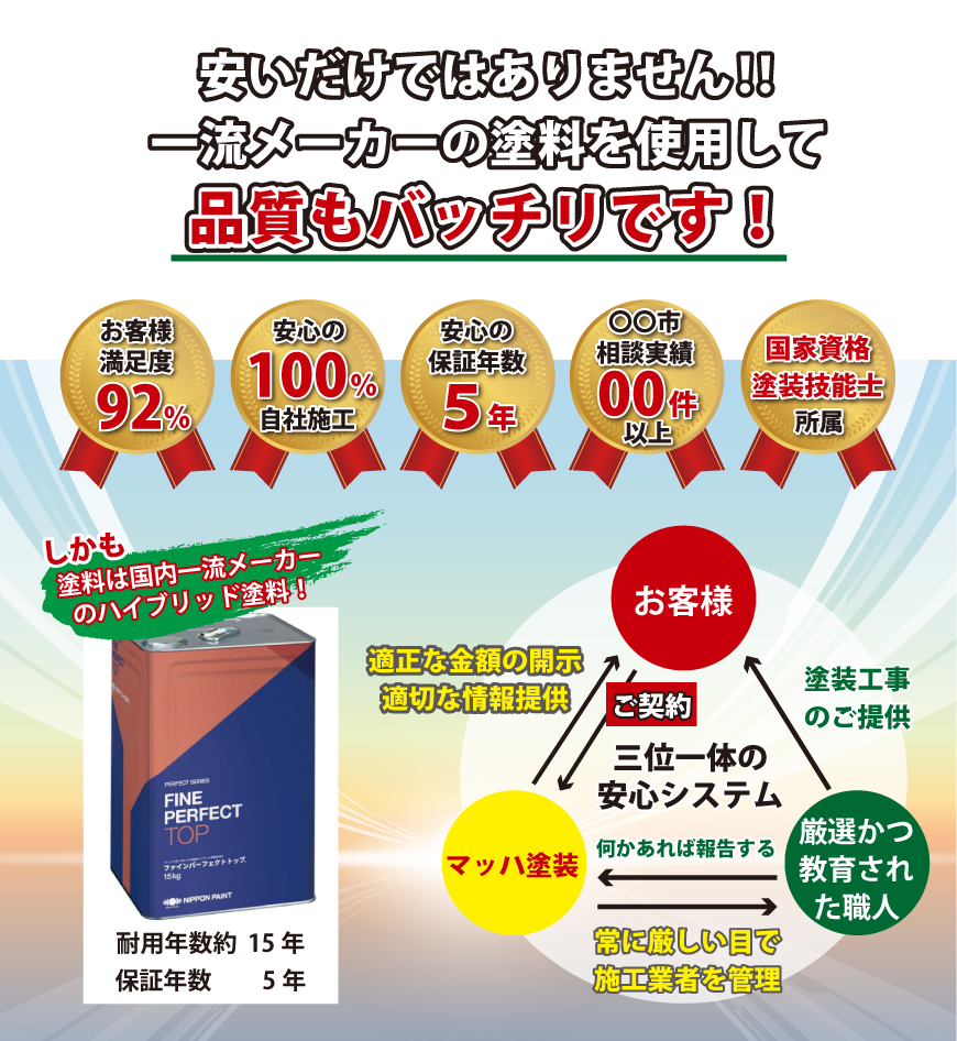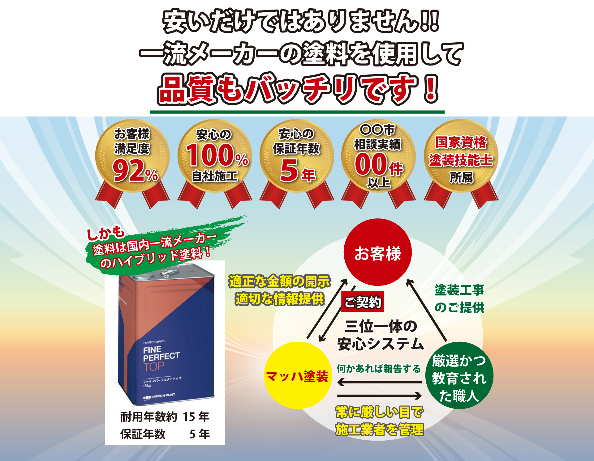 会社名は、多くの##市、##市エリアのお客様からご愛顧をいただき、 おかげさまで累計実績##件を突破しました。その結果、塗装の大量仕入れが実現でき、価格に反映させています。