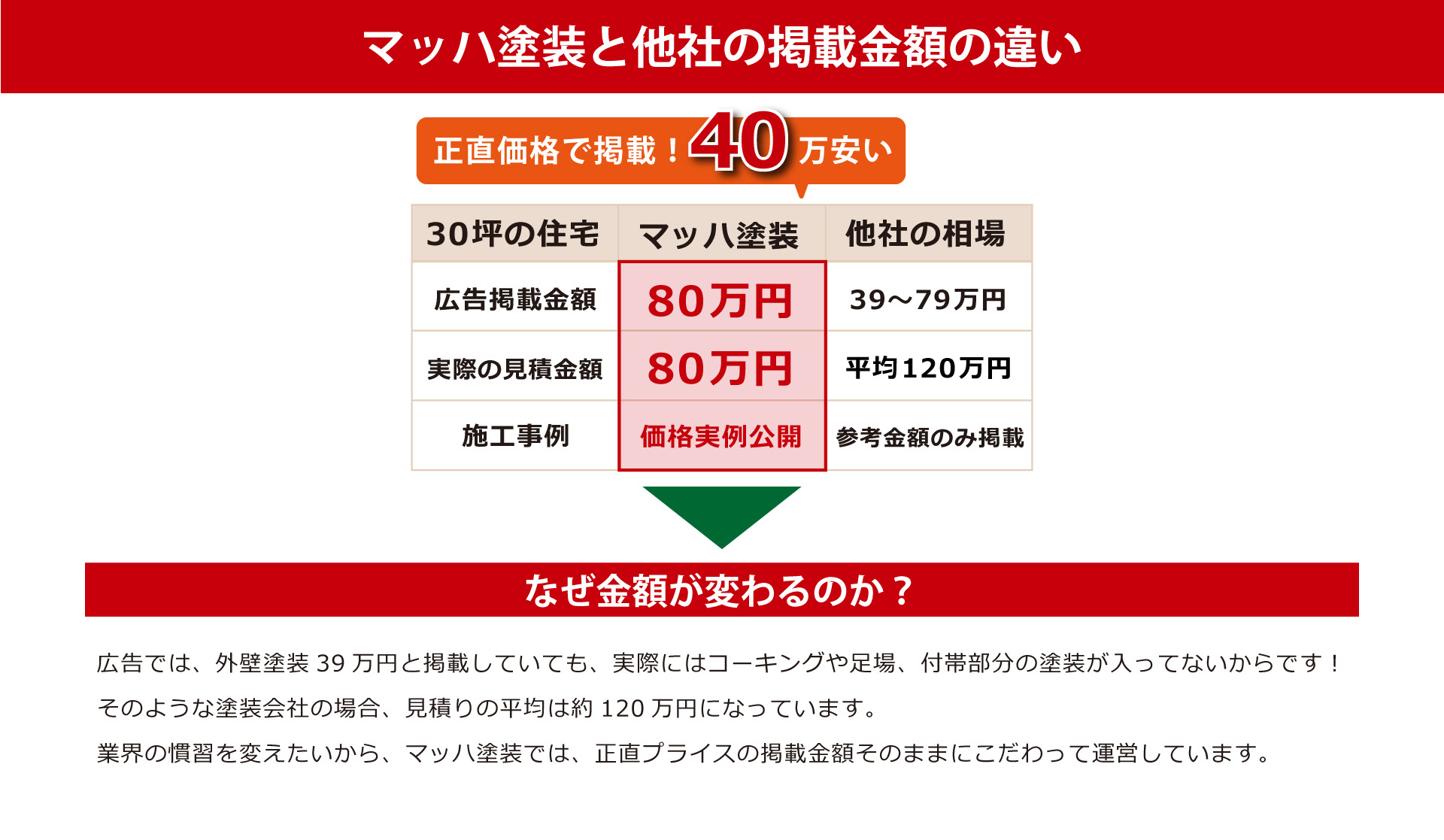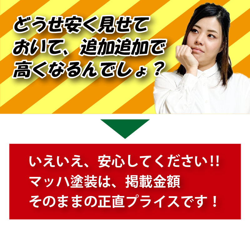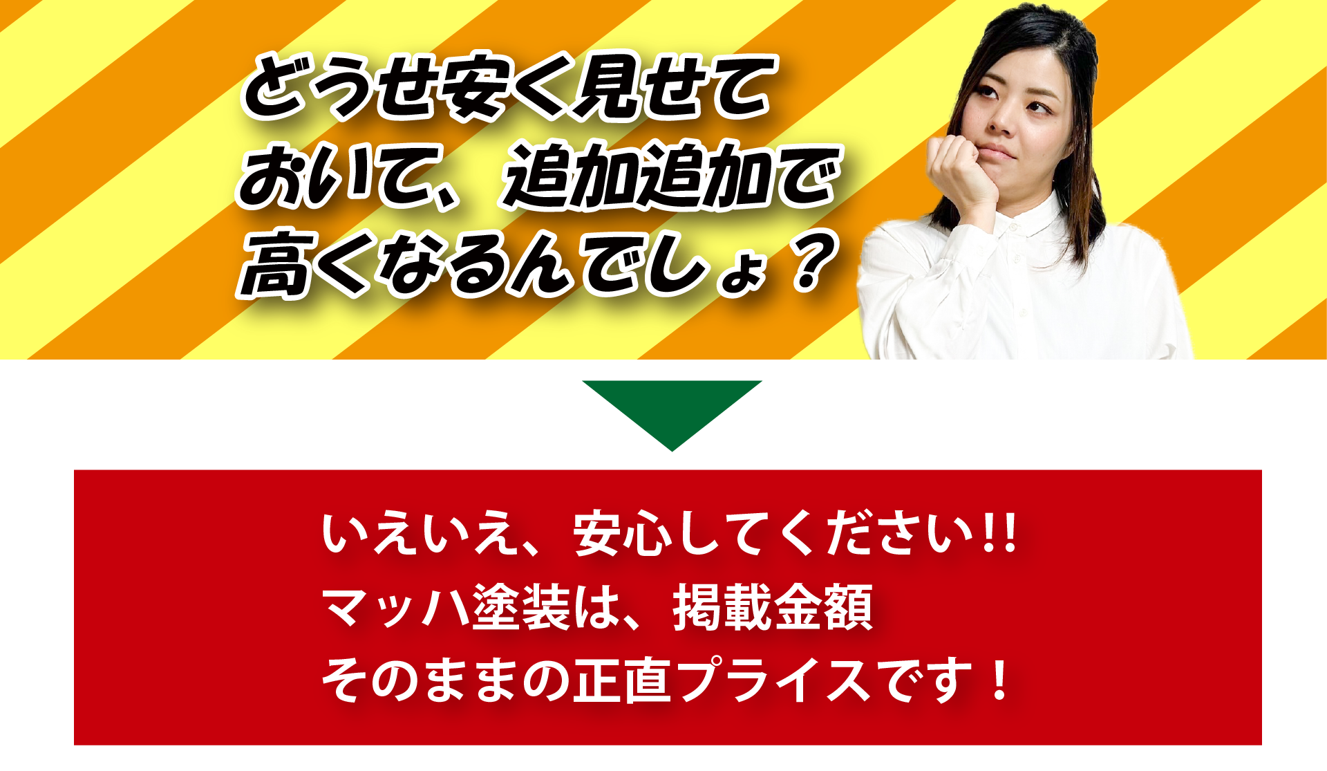 マッハ塗装は、最短最速で見積りを出しますが、適当な見積りを最初に出して、後から追加工事費用を請求することは行いません。