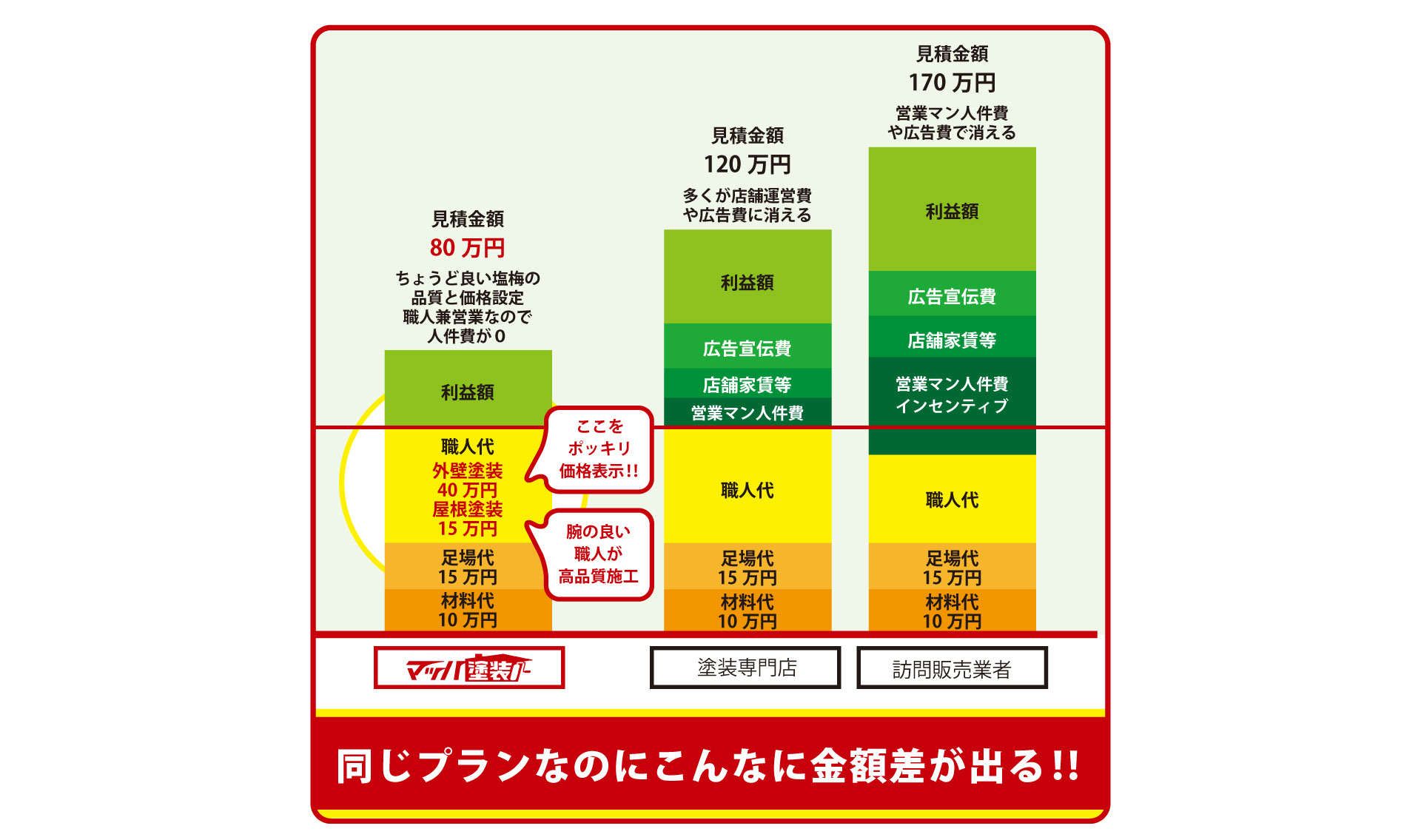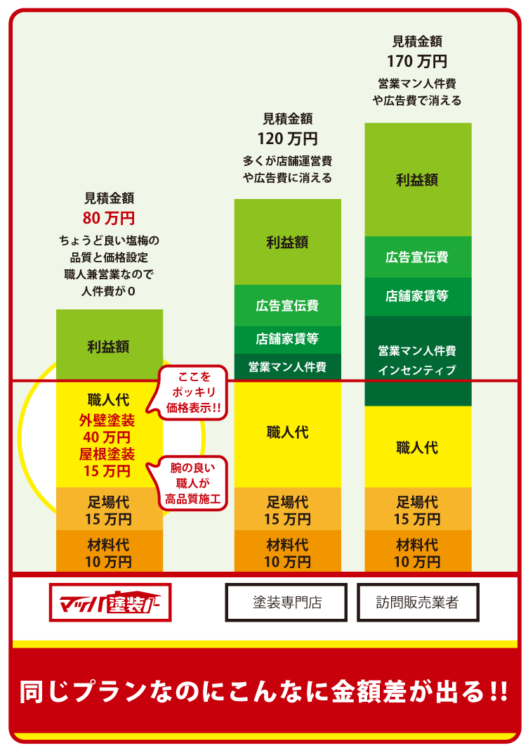 塗装専門店や訪問販売業社は、営業のお給料 (約30万円 + インセンティブ) を上乗せした価格がスタートラインになります。