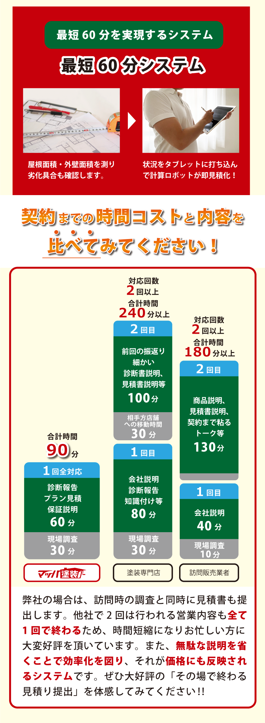長年培った経験によって、外壁面積や屋根面積を算出。以前のように何日もお待ちいただいた後に、 再度見積りを提出する日を取っていただいて〜というめんどくさい業界慣習を打破。 その場ですぐに見積りが出るからすぐ他社と比較できます。