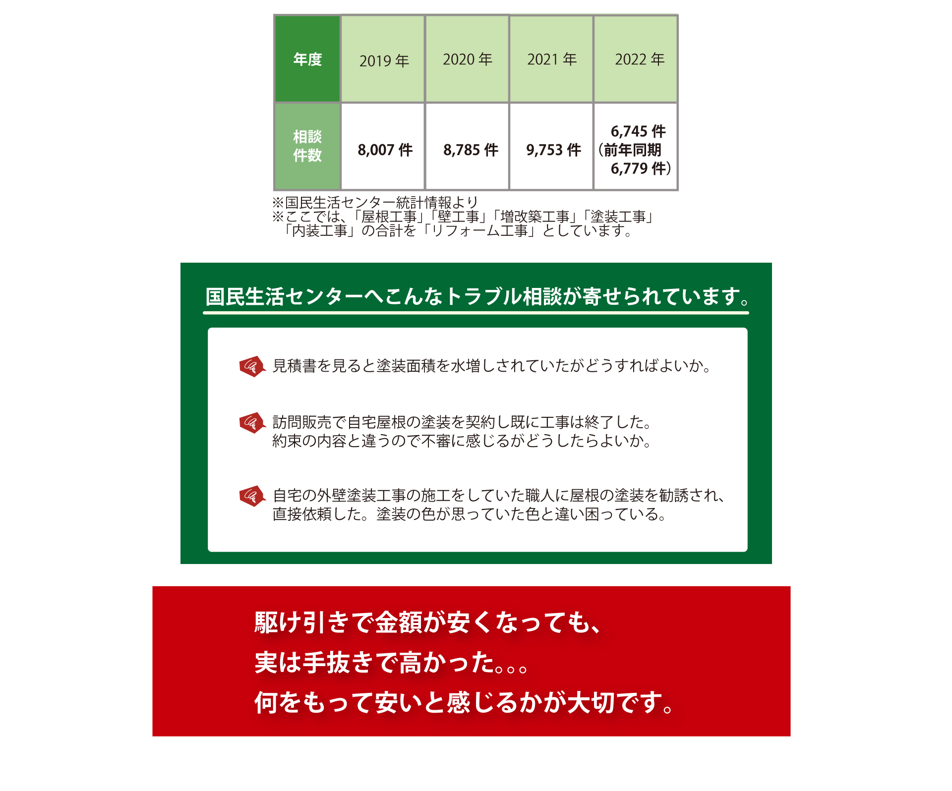 国民生活センターの被害相談件数の多くは、屋根外壁の外装関連です。